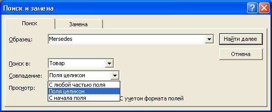 - значение в поле со списком Совпадение (Match) определяет один из трех вариантов совпадения образца со значением поля — С любой частью поля (Any Part of Field), Поля целиком (Whole Field), С начала поля (Start of Field);